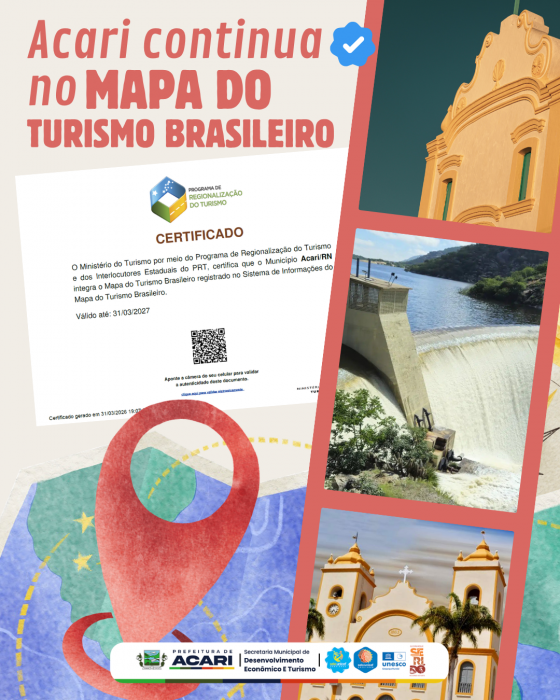 O Ministério do Turismo, por meio do Programa de Regionalização do Turismo (PRT) e dos Interlocutores Estaduais, certifica que o município de Acari/RN integra oficialmente o Mapa do Turismo Brasileiro, registrado no Sistema de Informações do Mapa do Turismo.