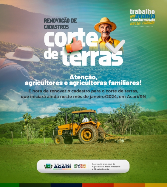 É com grande satisfação que informamos que está aberto o período de renovação de cadastros para o Corte de Terras, que terá início ainda neste mês de janeiro de 2024. Essa é uma oportunidade valiosa para todos os interessados em usufruir desse serviço essencial para o desenvolvimento de suas atividades agrícolas.