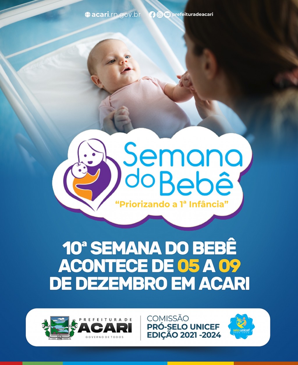 Com o tema: “Priorizando a 1ª Infância”, o município de Acari/RN realizará a 10ª edição da Semana do Bebê, desenvolvendo ações que objetivam assegurar a atenção adequada às crianças de até 6 anos de idade, promovendo discussões intersetoriais abordando temas como: aleitamento materno, nutrição, cobertura vacinal, educação infantil de qualidade, formação de vínculo e estimulação do bebê, por meio