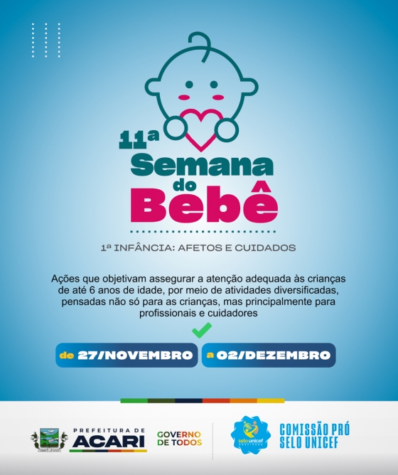 Com o tema: 1ª INFÂNCIA: AFETOS E CUIDADOS, o município de Acari/RN realizará a 11ª edição da Semana do Bebê, desenvolvendo ações que objetivam assegurar a atenção adequada às crianças de até 6 anos de idade, por meio de atividades diversificadas, pensadas não só para as crianças, mas principalmente para profissionais e cuidadores, abordando temas como: fortalecimento de vínculos, aleitamento materno exclusivo, crianças com deficiência, atraso no desenvolvimento, parentalidade positiva, disciplina não-violenta e cuidados responsivos; chamando atenção para o cuidado integral no universo da 1ª infância.