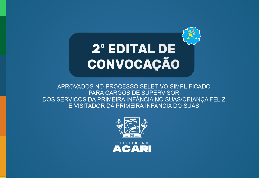 O MUNICÍPIO DE ACARI/RN, em cumprimento ao disposto no Edital nº 004/2021 do Processo Seletivo Simplificado, de ordem do Sr. Prefeito Municipal, neste ato através da Secretaria Municipal de Trabalho, Habitação e Assistência Social do Município de Acari/RN,e considerando que a 1º (primeira) classificada (Izairane Dutra de Sousa) convocada para o cargo de Supervisor dos Serviços da Primeira Infância no SUAS/CRIANÇA FELIZ e a 4ª (quarta) classificada (Simone Medeiros de Brito) convocada para o cargo de Visitador dos Serviços da Primeira Infância no SUAS/CRIANÇA FELIZ, não fizeram juntada dos documentos indispensáveis e necessários para a contratação, nos termos previstos no item 8.4 (Anexo IV – Calendário de Atividades – Entrega de documentos – 27/12/2021 – Sede da SEMTHAS), torna pública a CONVOCAÇÃO DOS SEGUINTES CANDIDATOS APROVADOS NO PROCESSO SELETIVO SIMPLIFICADO Nº 004/2021: