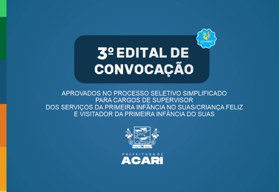 O MUNICÍPIO DE ACARI/RN, em cumprimento ao disposto no Edital nº 004/2021 do Processo Seletivo Simplificado, de ordem do Sr. Prefeito Municipal, neste ato através da Secretaria Municipal de Trabalho, Habitação e Assistência Social do Município de Acari/RN, e considerando que o 2ª (segundo) classificado (William Araújo Santos) convocado para o cargo de Supervisor dos Serviços da Primeira Infância no SUAS/CRIANÇA FELIZ e a 6ª (sexta) classificada (Buena Bruna Araújo Macêdo) convocada para o cargo de Visitador dos Serviços da Primeira Infância no SUAS/CRIANÇA FELIZ, não fizeram juntada dos documentos indispensáveis e necessários para a contratação, nos termos previstos no item 8.4 (Anexo IV – Calendário de Atividades – Sede da SEMTHAS), conforme Edital nº 004/2021, torna pública a CONVOCAÇÃO DOS SEGUINTES CANDIDATOS APROVADOS NO PROCESSO SELETIVO SIMPLIFICADO Nº 004/2021: