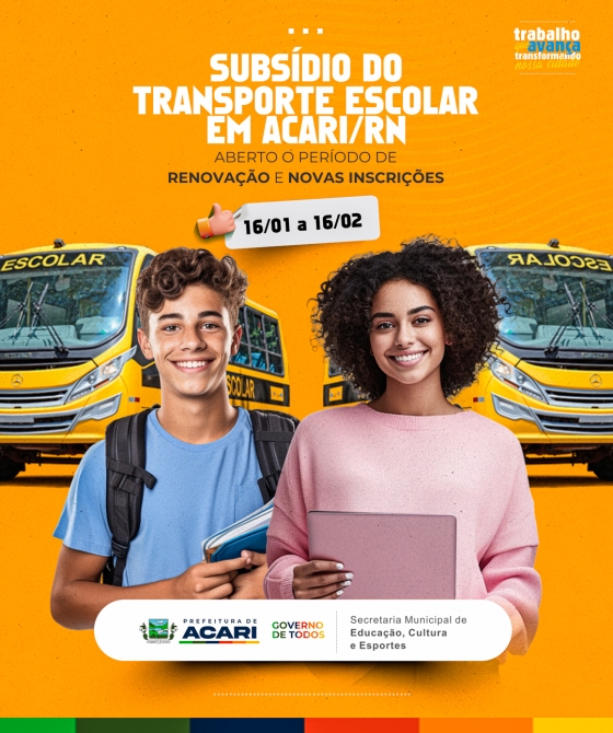 A Secretaria Municipal de Educação, Cultura e Esportes comunica que do 16 de janeiro a 16 de fevereiro de 2024 estará aberto o período para renovação e para novas inscrições dos estudantes interessados em receber o subsídio do transporte escolar.
