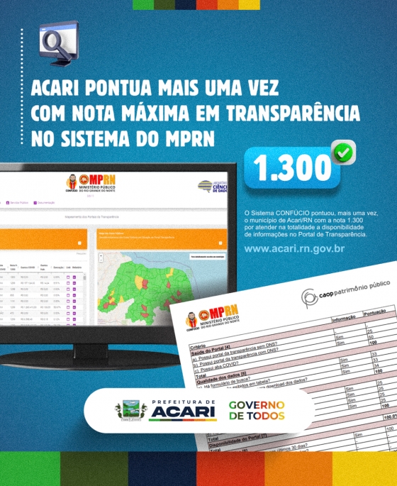 De acordo com relatório do Ministério Público do RN feito por meio do sistema de análise Confúcio, que monitora os Portais da Transparência dos Municípios e do Estado e disponibiliza o ranking de gastos, o município de Acari/RN, mais uma vez atinge nota máxima (1.300) no que diz respeito à transparência de gastos públicos.