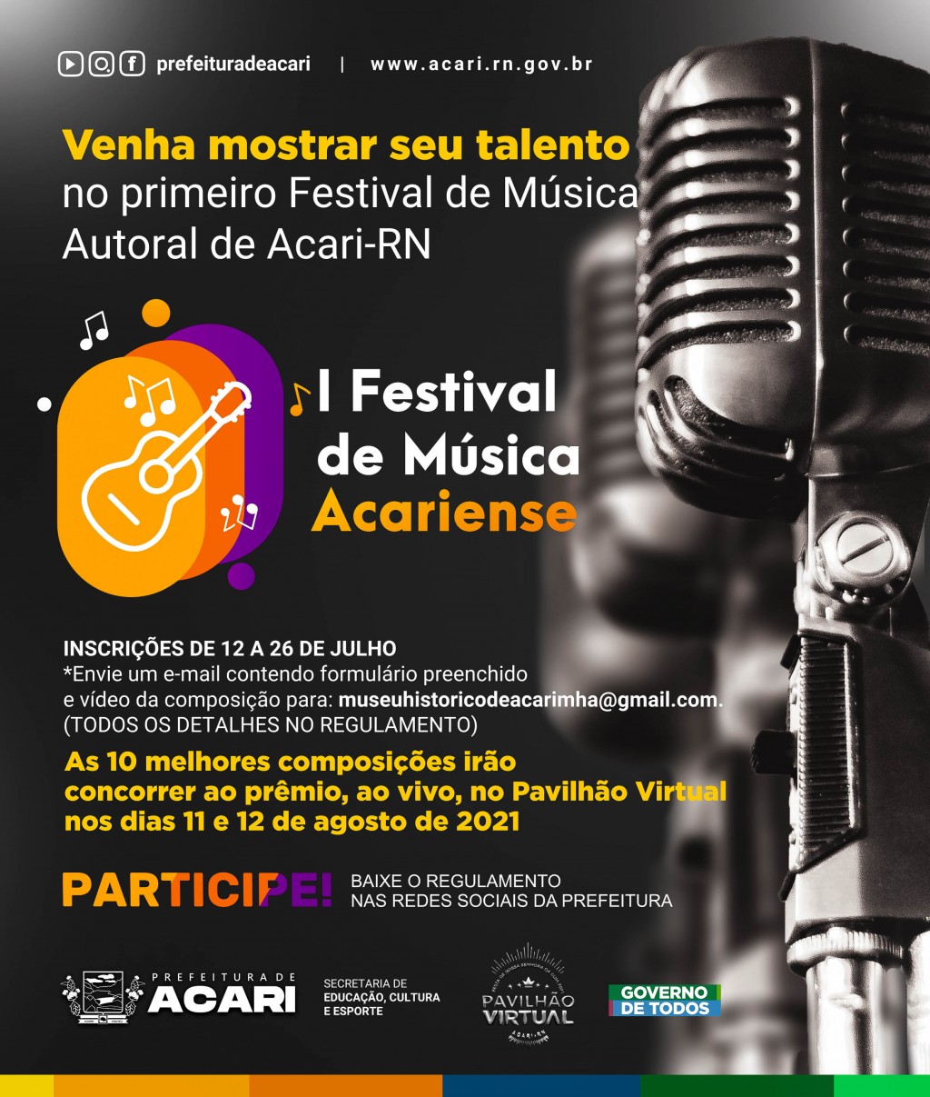 O 1º FESTIVAL DE MUSICA ACARIENSE é um projeto voltado prioritariamente para toda a comunidade acariense que se interessa pela música e pela poesia, principalmente autoral. Em síntese, tem como objetivo valorizar os artistas locais, de Acari e do Seridó.