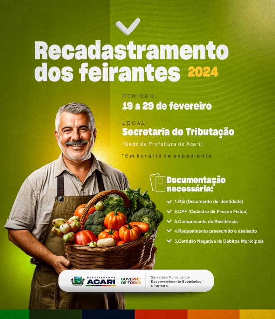 A Prefeitura de Acari/RN, por meio das Secretarias de Tributação e Desenvolvimento Econômico, convoca todos os feirantes do município para fazer um recadastramento para o ano de 2024, tendo em vista, a regularização e atualização dos registros dos feirantes. É imprescindível que todos os feirantes participem deste processo para manter a ordem e a transparência nas atividades da feira.