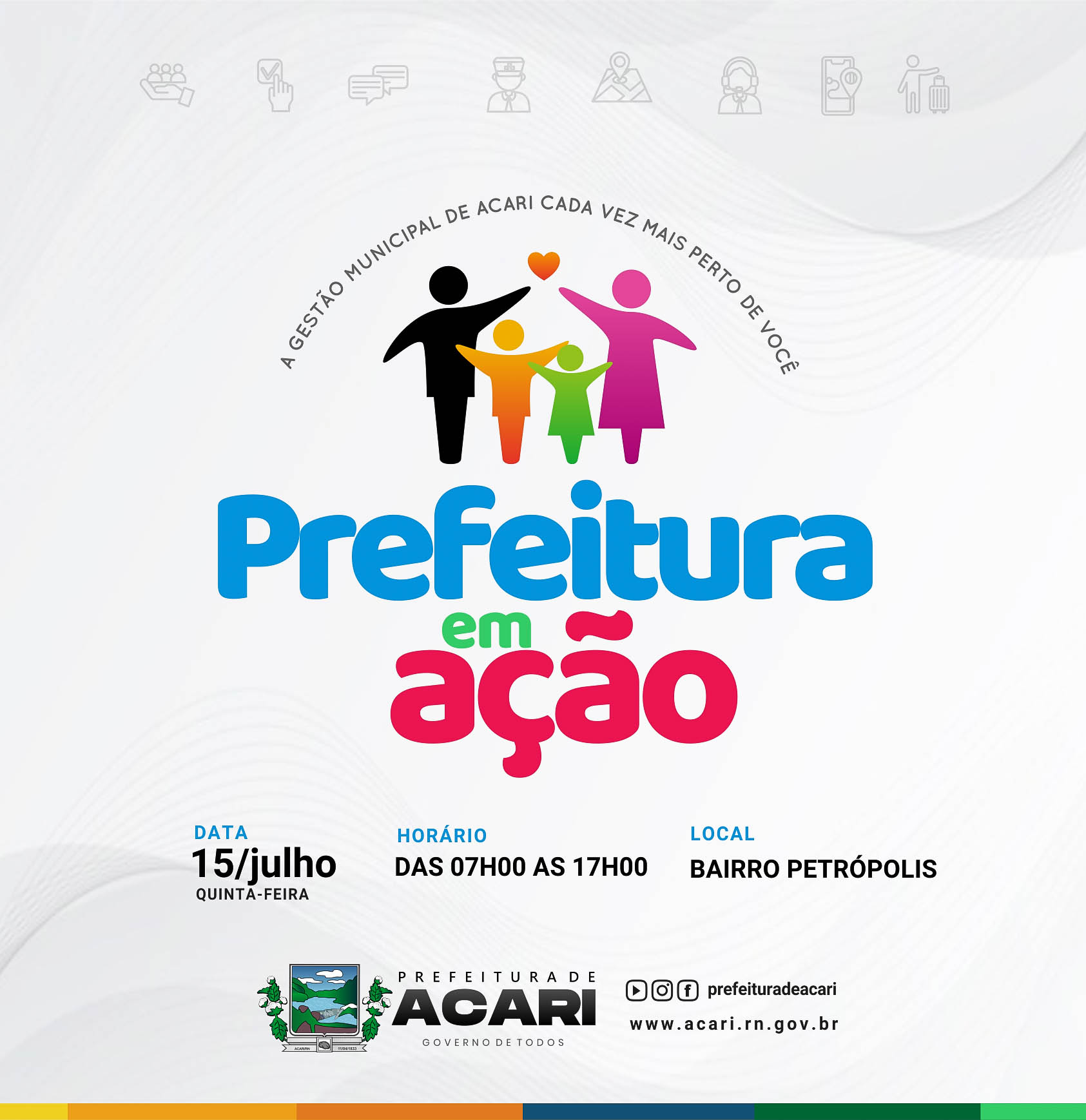 O projeto consiste em levar a Gestão Municipal cada vez mais perto das pessoas através dos serviços desenvolvidos pela administração pública local. Nesta quinta-feira, dia 15 de julho, a partir das 07h00, o bairro Petrópolis será a localidade a receber o "Prefeitura em Ação", com limpeza geral, serviços de saúde, ações educacionais e literárias, apoio à empreendedores, assistência social, ações do meio ambiente, esporte e outros. CONFIRA TODA A PROGRAMAÇÃO: 07h - Limpeza geral no bairro Petrópolis (retirada de entulhos, lixo, limpeza de mato, terrenos e canteiros). - SERVIÇOS URBANOS 07h30 - Programa Saúde na Escola e Contação de História (Mediadoras de Leitura) - EDUCAÇÃO, CULTURA E ESPORTE. CMEI: Avaliação Nutricional Escola Porfíria `Pires: Saúde Bucal 07h às 11h – Atendimentos Saúde Sexual e Reprodutiva, Vacinação e Hiperdia (PSF I) – SAÚDE. 07h às 11h – Ações de enfrentamento à Dengue, com visitas in loco (agentes de Endemias) – SAÚDE. 07h às 11h - Emissão de boletos de contribuição mensal INSS/ICMS do MEI - SCFV - DESENVOLVIMENTO ECONÔMICO E TURISMO 07h às 11h - Realização do CADASTUR para segmentos do turismo – visita aos estabelecimentos interligados ao turismo - DESENVOLVIMENTO ECONÔMICO E TURISMO 07h às 15h – Emissão de Carteira do Idoso (Cadastro Único) SCFV ASSISTÊNCIA SOCIAL 07h às 15h – Entrega de Kits de Atividades do Programa Criança Feliz e SCFV (Crianças e Adolescentes) - SCFV ASSISTÊNCIA SOCIAL 08h - Instalação de ponto de coleta seletiva com troca de material reciclável por uma muda, se criança distribuição de pipoca (Bilezão) - AGRICULTURA E MEIO AMBIENTE. 08h – Ações do Busca Ativa Escolar (CMEI e Porfíria) - EDUCAÇÃO, CULTURA E ESPORTE. 08h às 11h: Curso de Formação para técnicos de Futsal – SCFV - EDUCAÇÃO, CULTURA E ESPORTE. 08h às 12h: Atendimento dos serviços de tributação do município - ADMINISTRAÇÃO 08h às 12h – Plantão Jurídico aos moradores do bairro - tira dúvidas (Dra. Ladjany e Dr. Paulo Bulhões) – ASSISTÊNCIA SOCIAL E PROCURADORIA JURÍDICA 08h às 12h – Plantão Psicossocial – CRAS E CREAS (SCFV) – ASSISTÊNCIA SOCIAL 13h às 14h - Apoio ao microempreendedor com a abertura do CNPJ/MEI – palestra informativa tendo como público alvo os concluintes dos cursos de Pedreiro e Mecânico em máquina de costura industrial do SENAI e entrega de certificados (SCFV) DESENVOLVIMENTO ECONÔMICO E TURISMO e ASSISTÊNCIA SOCIAL 13h às 17h – Atendimentos Saúde Sexual e Reprodutiva, Vacinação e Hiperdia (PSF I) – SAÚDE. 13h às 17h – Ações de enfrentamento a Dengue, com visitas in loco (agentes de Endemias) – SAÚDE. 13h:30: - Programa Saúde na Escola e Contação de História (Mediadoras de Leitura) - EDUCAÇÃO, CULTURA E ESPORTE. CMEI: Saúde Bucal Porfíria: Avaliação Nutricional 13h:30 às 16h: Curso de Formação para técnicos de Futsal – Aulas Práticas (Bilezão) - EDUCAÇÃO, CULTURA E ESPORTE. 13h às 16h - Informações sobre o Microcrédito da AGN (SCFV) - DESENVOLVIMENTO ECONÔMICO E TURISMO 14h às 15h - Apoio ao microempreendedor com a abertura do CNPJ/MEI – palestra informativa tendo como público alvo os concluintes do curso de Costura em malha do SENAI e entrega de certificados (SCFV) DESENVOLVIMENTO ECONÔMICO E TURISMO E ASSISTÊNCIA SOCIAL 14h30 às 16h30 - Atendimento veterinário aos residentes no bairro - SCFV- AGRICULTURA E MEIO AMBIENTE 16h – Distribuição da ceia e roupas confeccionadas pelos alunos do curso de costura em malha (SCFV) - ASSISTÊNCIA SOCIAL 17h - LIVE DE ENCERRAMENTO • Plantio de mudas no largo da capela de Santa Rita- AGRICULTURA E MEIO AMBIENTE • Culminância do Projeto: Ler, Conhecer e Devolver (Casinhas) – EDUCAÇÃO,CULTURA E ESPORTES • Apresentação das pavimentações realizadas: complemento da Rua Desembargador Silvino Adonias Bezerra e Rua João Soares de Medeiros - TRANSPORTES E OBRAS • Obras em andamento: Pavimentação da Rua Gabriel Severiano, largo do Campo de Futebol Pedro Celestino, Galpão Industrial – TRANSPORTES E OBRAS. • Melhorias na infraestrutura das escolas municipais CMEI e Porfíria Pires – TRANSPORTES E OBRAS