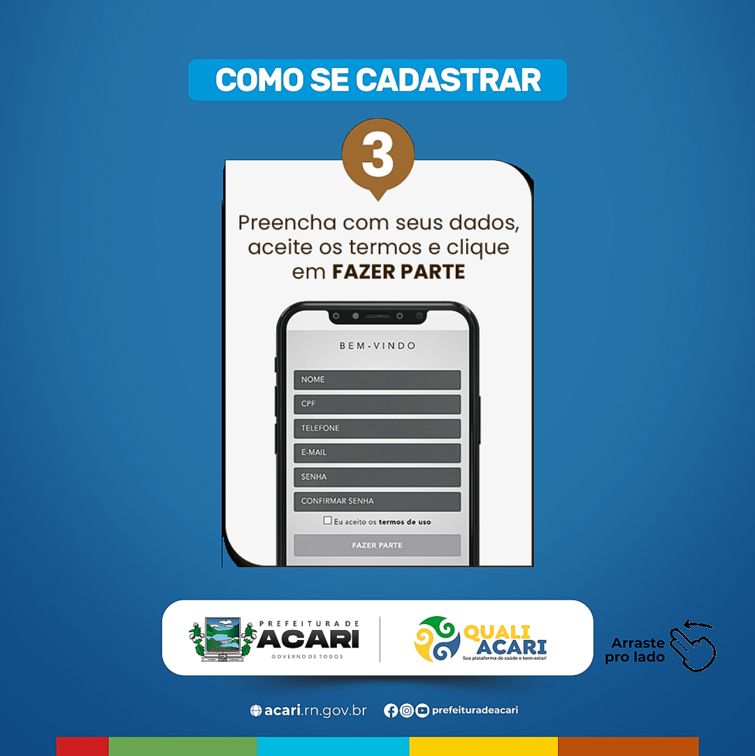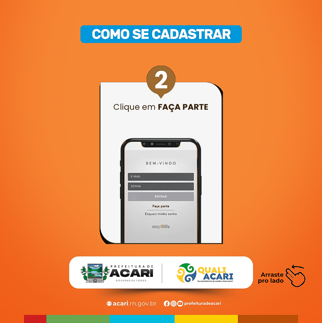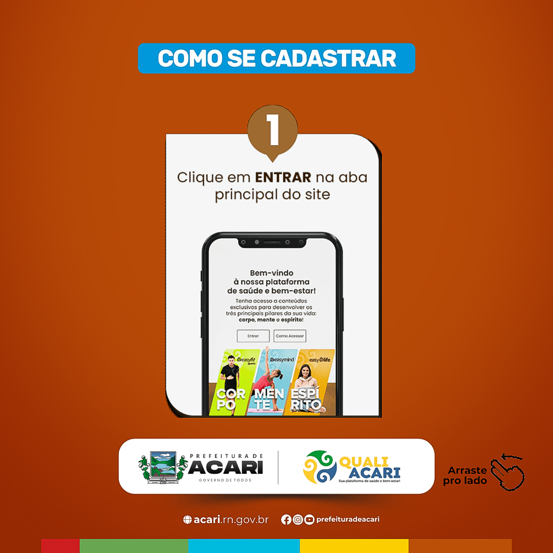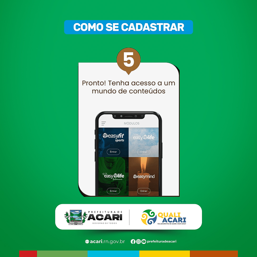 A #PrefeituraDeAcari, trás para você uma grande novidade, uma plataforma completa de saúde e bem-estar que oferece gratuitamente conteúdos que melhoram os três principais pilares do ser humano: corpo, mente e espírito, é o QUALI ACARI, uma parceria com o grupo Easy Life. Para ter acesso, basta se cadastrar no link, que está disponível em nossas redes sociais e em destaque no niste oficial da prefeitura de Acari.