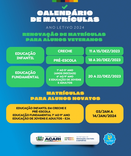 É com entusiasmo que anunciamos a abertura do Calendário de Matrículas para o ano letivo de 2024 na Rede Municipal de Ensino. Este é um momento crucial que marca o início de uma jornada educacional repleta de descobertas, aprendizado e crescimento.