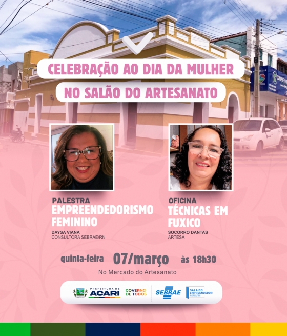 A Prefeitura de Acari, por meio da Secretaria Municipal de Trabalho, Habitação e Assistência Social (SEMTHAS), em parceria com a secretaria de Desenvolvimento Econômico e Turismo juntos à Sala do Empreendedor e SEBRAE –RN, realizará um momento em celebração ao Dia Internacional da Mulher.