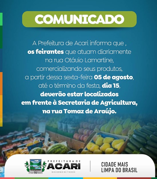 A Prefeitura de Acari informa que, os feirantes que atuam diariamente na rua Otávio Lamartine, comercializando seus produtos, a partir dessa sexta-feira, dia 05 de agosto, até o término da festa, dia 15, deverão estar localizados em frente à Secretaria de Agricultura, na rua Tomaz de Araújo.