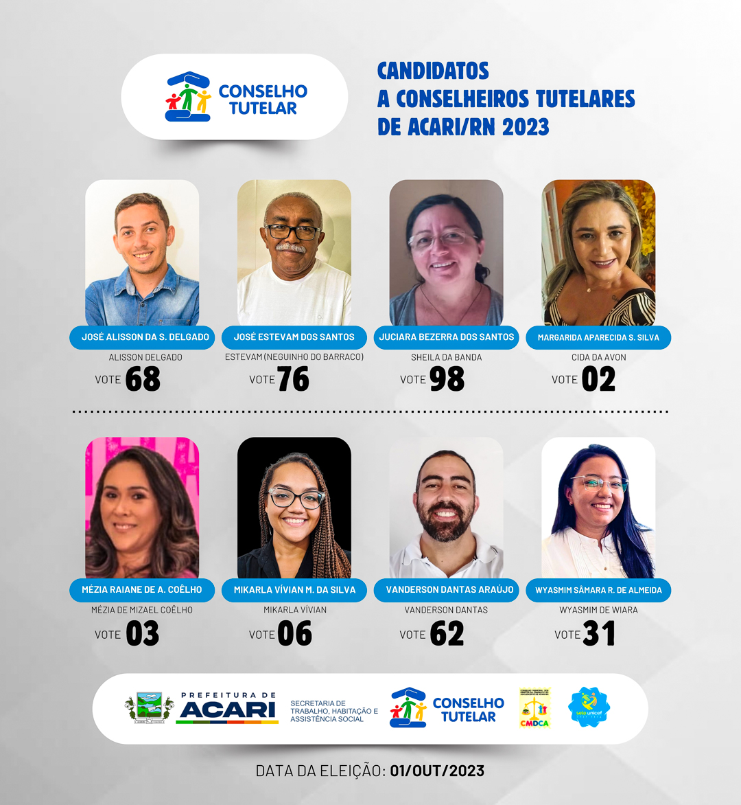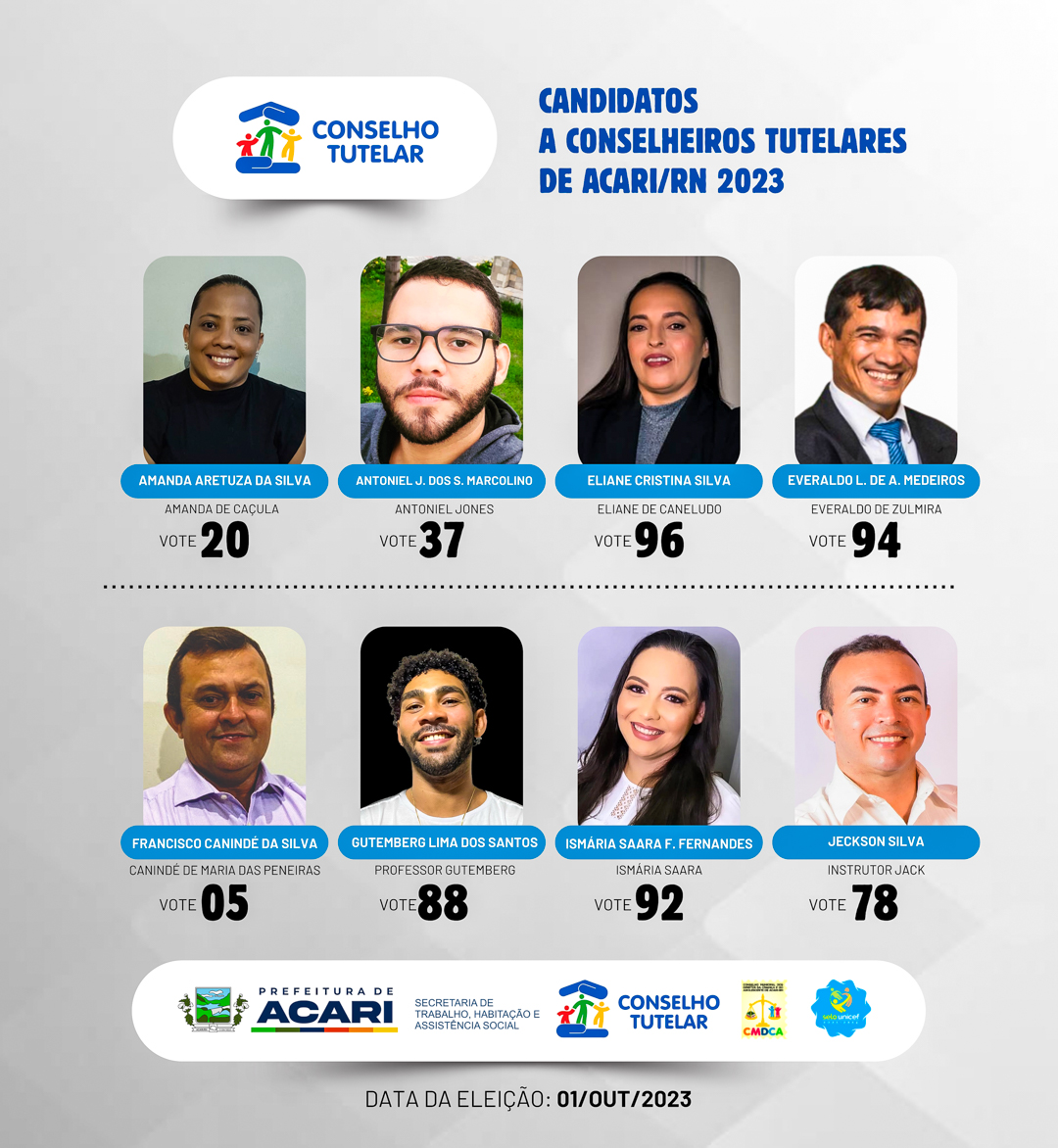 O Conselho Municipal dos Direitos da Criança e do Adolescente de Acari/RN (CMDCA) e Prefeitura de Acari, através da Secretaria Municipal de Trabalho, Habitação e Assistência Social (SEMTHAS) divulga a relação dos candidatos aptos a Conselheiro(a) Tutelar de Acari/RN. Os candidatos a seguir (por ordem alfabética) passaram por prova de avaliação de conhecimentos específicos e tiveram suas candidaturas deferidas.