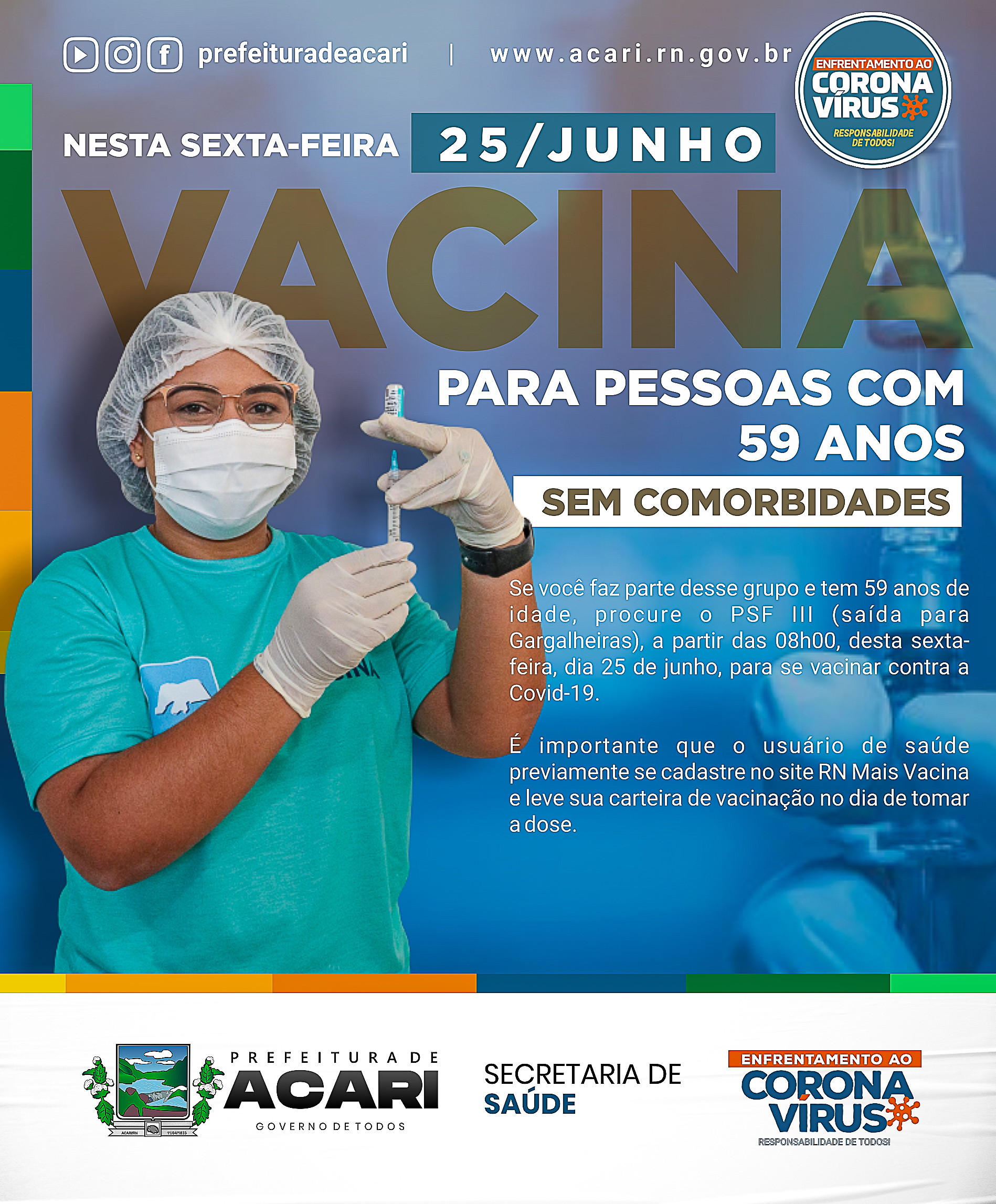 A secretaria municipal de saúde de Acari, dará início nesta sexta-feira, dia 25 de junho, a partir das 08h00, à vacinação contra a Covid-19 para pessoas sem comorbidades na faixa etária de 59 anos. Se você faz parte desse grupo, procure o posto de saúde PSF III (saída para Gargalheiras), na data e horário citados acima para se vacinar contra a Covid-19.
