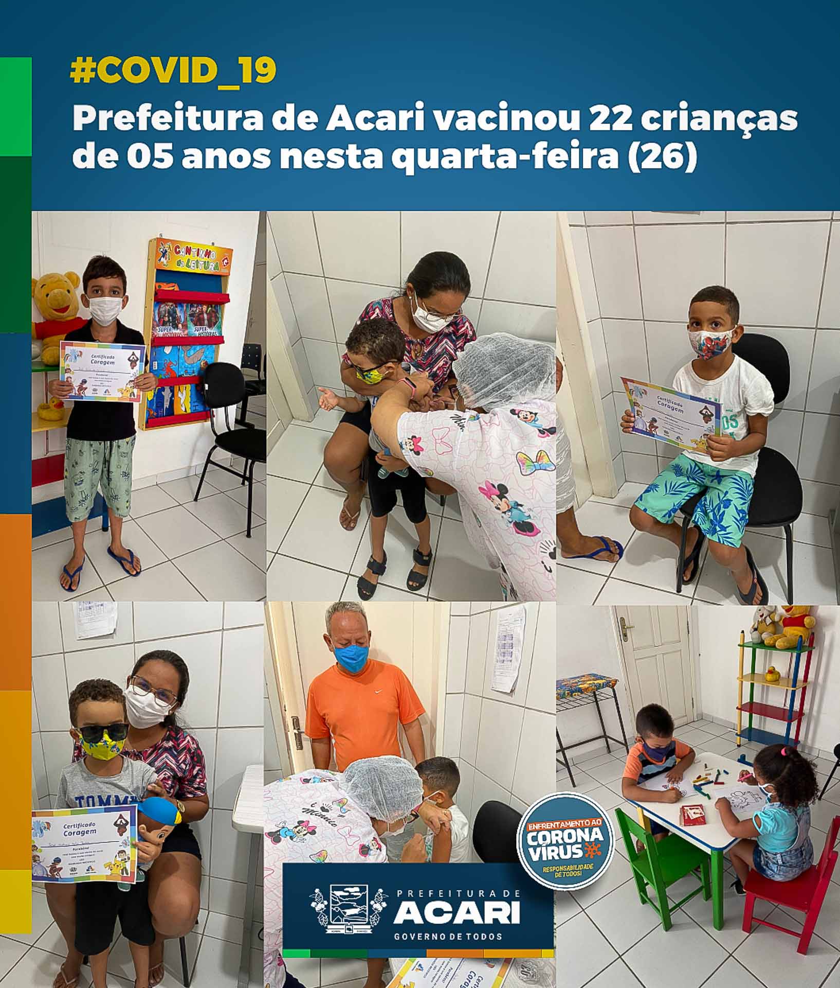 Em Acari, as crianças sem comorbidades começam a ser vacinadas contra a Covid-19. Nesta quarta-feira, dia 26 de janeiro, vinte e duas (22) crianças de 05 anos receberam a primeira dose da vacina. As doses foram aplicadas pelas equipes do PSF III (bairro Tarcísio Bezerra). Em breve, de forma crescente na faixa etária, mais crianças estarão sendo beneficiadas.