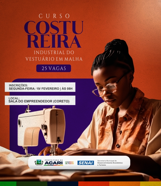 A Prefeitura de Acari, por meio da Secretaria Municipal de Desenvolvimento Econômico e Turismo, informa que próxima segunda-feira, dia 19 de fevereiro, às 8 horas da manhã, na Sala do Empreendedor (Coreto), estarão abertas inscrições para Costureiro Industrial do Vestuário em Malha.
