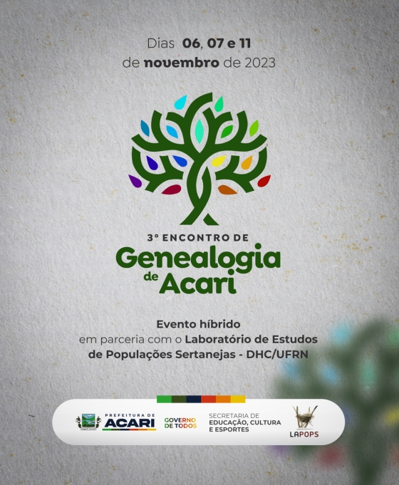 Prefeitura de Acari, por meio da Secretaria de Educação, Cultura e Esportes, através do Museu Histórico, realizará mais um encontro de Genealogia de Acari, sendo a sua 3ª edição, em parceria com o Laboratório de estudos de populações sertanejas - DHC/UFRN. Um evento, que será híbrido (on line e presencial), no qual indivíduos interessados em pesquisar e explorar suas origens familiares se reúnem para compartilhar informações, aprender técnicas de pesquisa genealógica, trocar experiências e documentos, e colaborar na construção de suas árvores genealógicas.