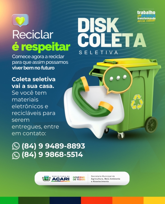 Se você possui materiais eletrônicos ou recicláveis que precisam ser descartados de maneira responsável, a solução está a apenas uma ligação de distância. O Disk Coleta Seletiva em Acari está em pleno funcionamento, e a equipe está pronta para facilitar o descarte adequado desses itens.