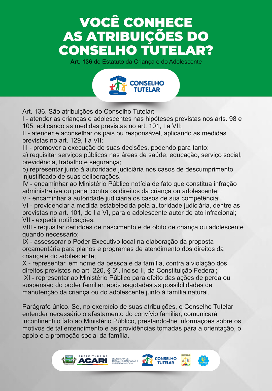 Art. 136. São atribuições do Conselho Tutelar: