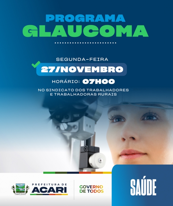 A Prefeitura de Acari, através da secretaria municipal de saúde, comunica aos usuários que a equipe do Programa Glaucoma estará no município nesta próxima segunda-feira, dia 27 de novembro, no Sindicato dos Trabalhadores e Trabalhadoras Rurais, a partir das 07h00.
