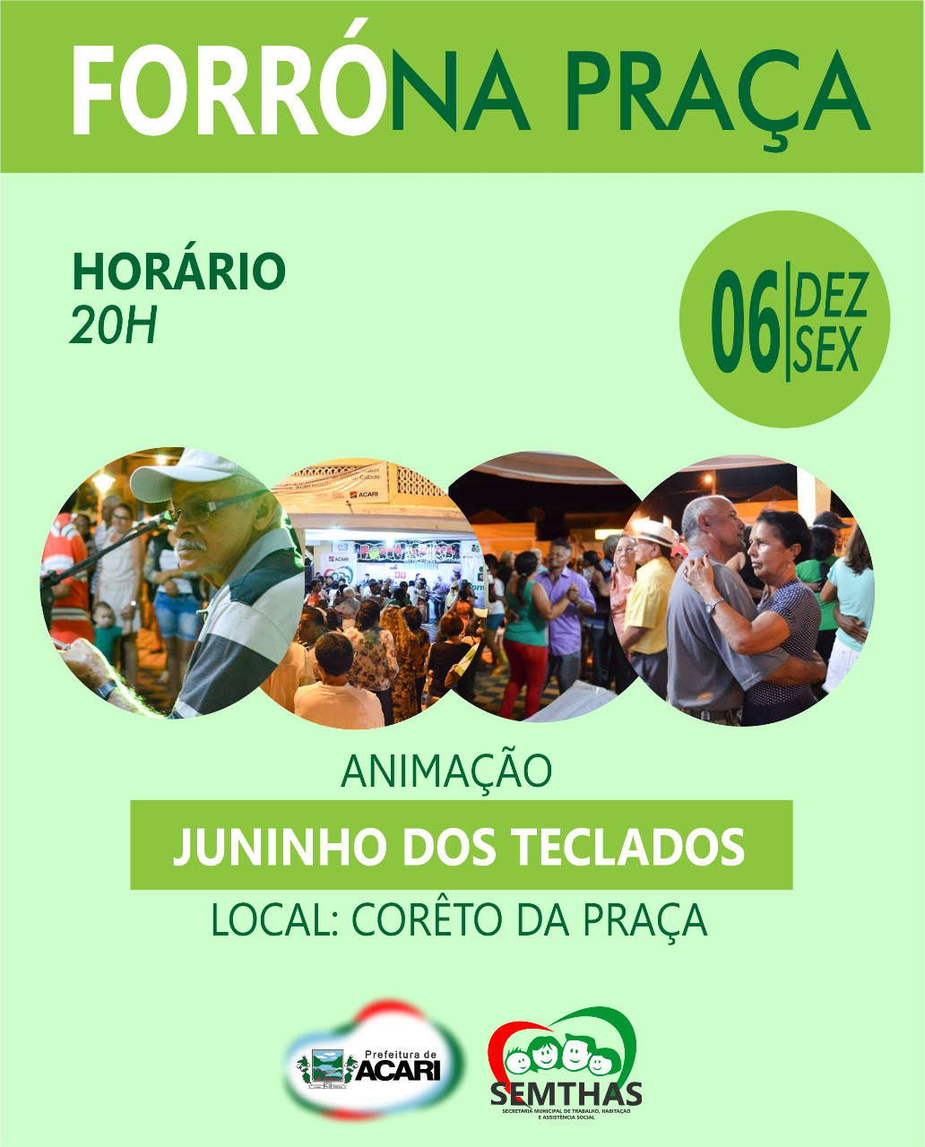Atenção comunidade acariense, a Prefeitura de Acari através da Secretaria de Assistência Social realiza nesta sexta feira (06) mais uma edição do FORRÓ NA PRAÇA, a partir das 20h no Corêto da Praça. Vai ser muito forró com a animação de Juninho dos teclados, todos convidados!