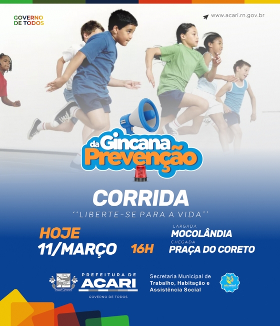 Com o tema: "PREVENIR: UM ATO DE AMOR", o município de Acari/RN realiza mais uma Semana de Prevenção ao Uso de Drogas e Conscientização da Juventude, tendo por base a Lei Municipal nº 1.320/2023, desenvolvendo ações que objetivam conscientizar crianças e adolescentes, por meio de atividades diversificadas, que vão desde práticas esportivas, momentos culturais, a rodas de interação entre profissionais e comunidade escolar. A programação inicia hoje, dia 11 de março, com uma corrida que faz parte da "Gincana da Prevenção", com tema: "Liberte-se para a vida". Essa é a primeira etapa da gincana, contemplando alunos do Ensino Médio, 6º ao 9º ano e Polícia Mirim. Os resultados da corrida já somam pontos para a gincana.