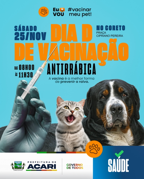 Sábado, dia 25 de novembro, a Prefeitura de Acari, por meio da Secretaria Municipal de Saúde, se mobiliza para o "Dia D de Vacinação Antirrábica", uma iniciativa muito importante para a saúde de nossos animais de estimação, e consequentemente da nossa população. Das 08h às 11h30, o Coreto da Praça Cipriano Pereira será o ponto de encontro para a imunização de cães e gatos contra a Raiva, uma doença séria que pode afetar tanto animais quanto seres humanos.