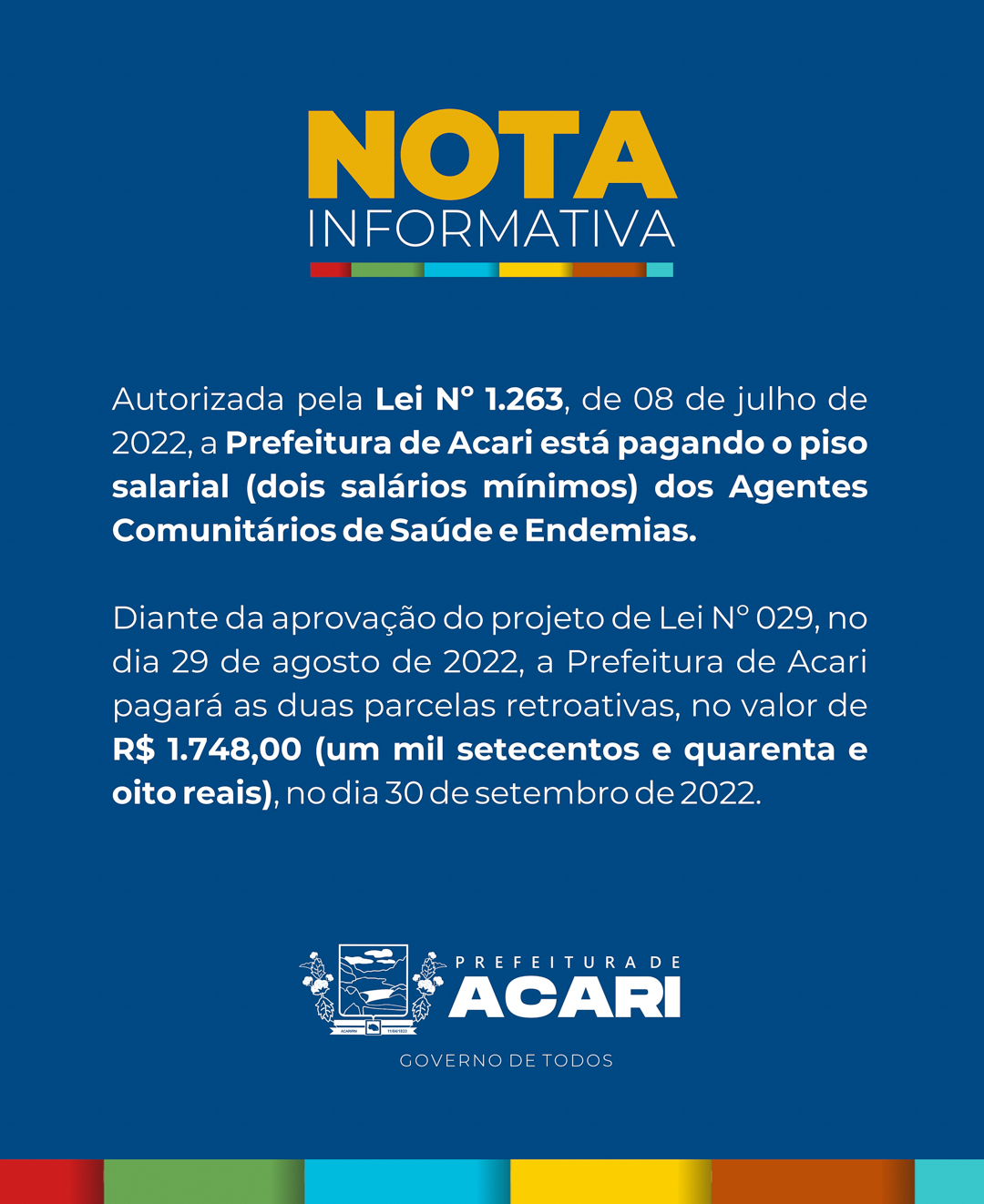 Diante da aprovação do projeto de Lei Nº 029, no dia 29 de agosto de 2022, a Prefeitura de Acari pagará as duas parcelas retroativas, no valor de R$ 1.748,00 (um mil setecentos e quarenta e oito reais), no dia 30 de setembro de 2022.