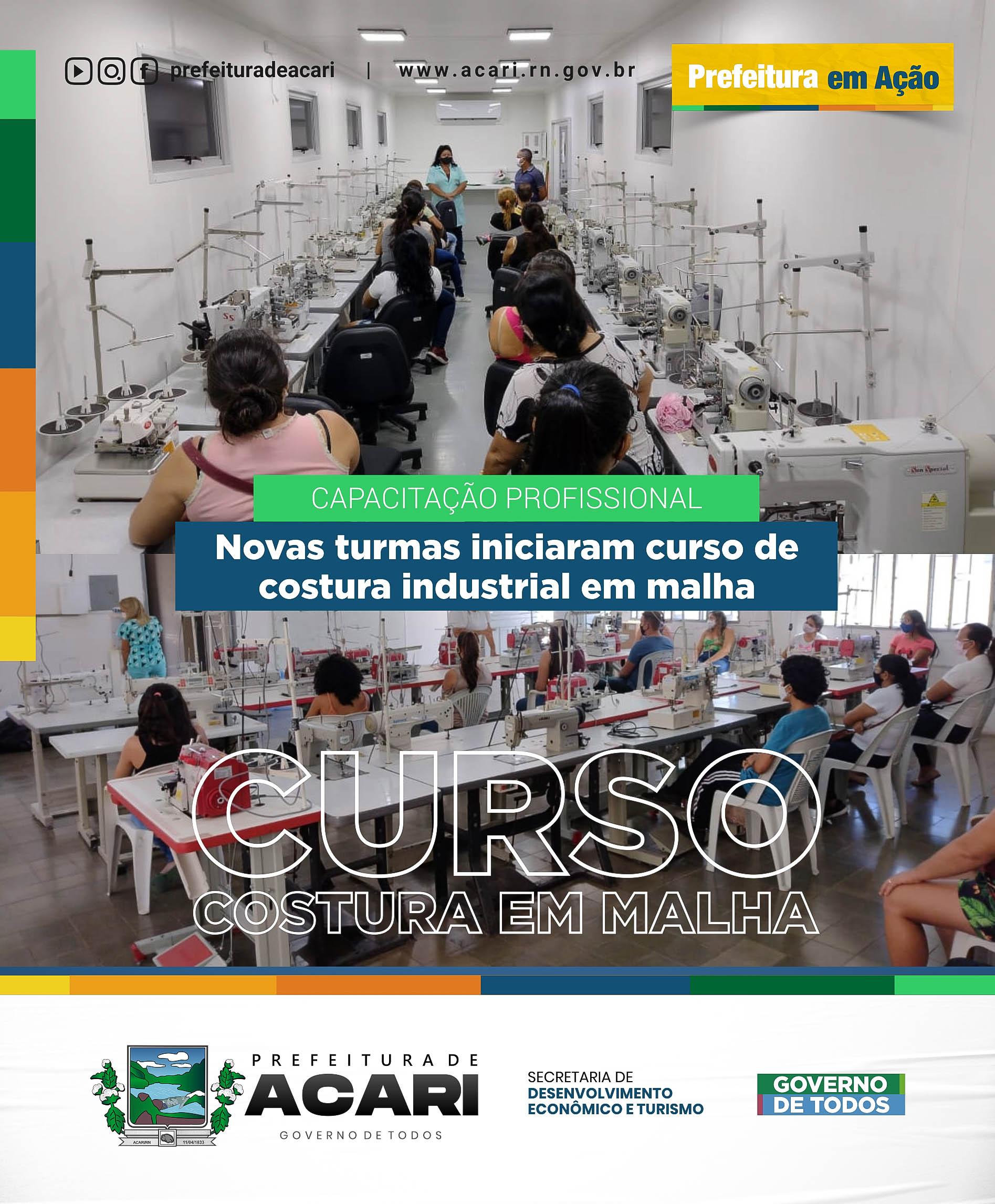 Através de parceria com o SENAI e empresários da região, a Prefeitura de Acari após concluir as primeiras turmas do curso de Costura Industrial em Malha, capacitando 100 pessoas, deu início na manhã detsa terça-feira, dia 27 de abril, a mais duas turmas, 48 alunos e alunas. O curso está sendo ministrado na sede da secretaria de desenvolvimento econômico e na unidade móvel do SENAI, 22 alunos(as) na carreta e 26 alunos(as) na secretaria, com uma carga horária de 160 horas, tendo previsão de conclusão no mês de maio/2021. Serão mais 48 acarienses capacitados(as) e aptos(as) ao mercado de trabalho, no segmento da indústria têxtil.