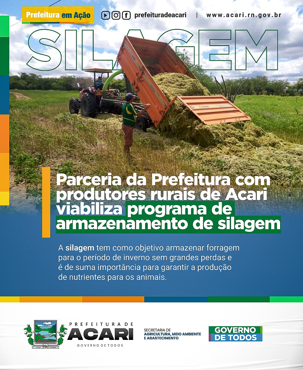 Através da secretaria municipal de agricultura, meio ambiente e abastecimento, a Prefeitura de Acari está mantendo parceria com os produtores rurais com objetivo de desenvolver ações e incentivos à produção no campo, uma delas é o Programa de Armazenamento de Silagem, que visa garantir a forragem