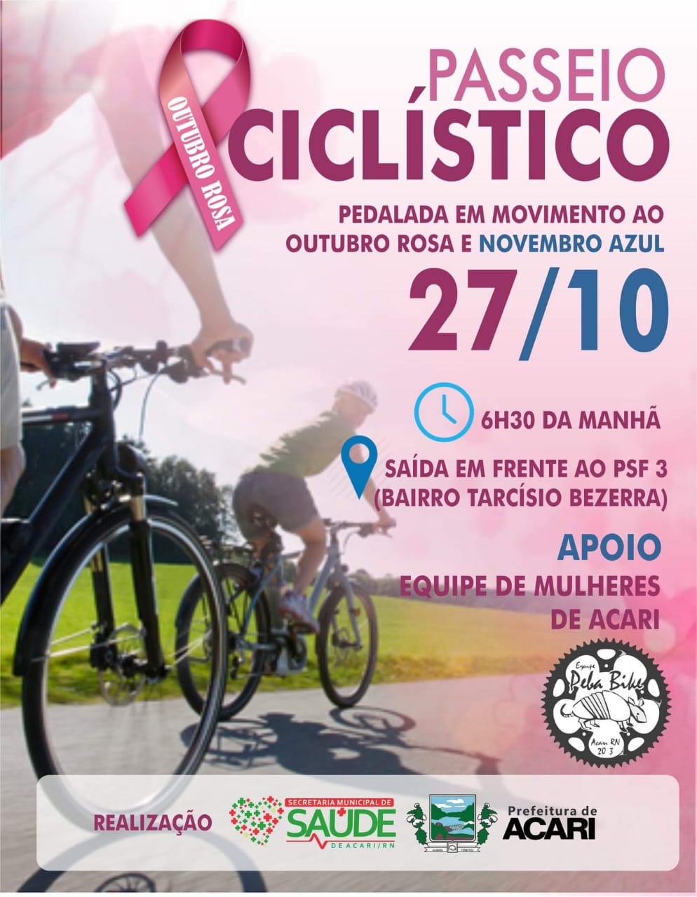 A Secretaria de Saúde de Acari, através da Prefeitura de Acari, irá realizar o PASSEIO CICLÍSTICO em alusão ao Outubro Rosa e do Novembro Azul, meses que intensificam a prevenção ao Câncer de Mama e o Câncer de Próstata, respectivamente. O evento tem apoio da Equipe de Mulheres de Acari e da equipe Pebas Bike.