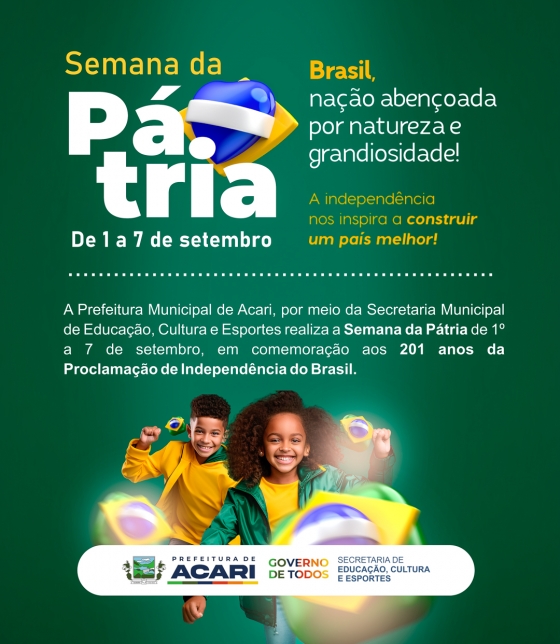 No período de 1º a 7 de setembro, a Prefeitura de Acari, por meio da SEMECE - Secretaria Municipal de Educação, Cultura e Esportes, promoverá uma série de atividades em celebração à Semana da Pátria, que incluirão solenes cerimônias de hasteamento e arriamento diário da Bandeira Nacional. Estes momentos, comemorando os 201 anos de Proclamação da Independência do Brasil, terão lugar no Largo do Museu Histórico e estão agendados para os seguintes horários: