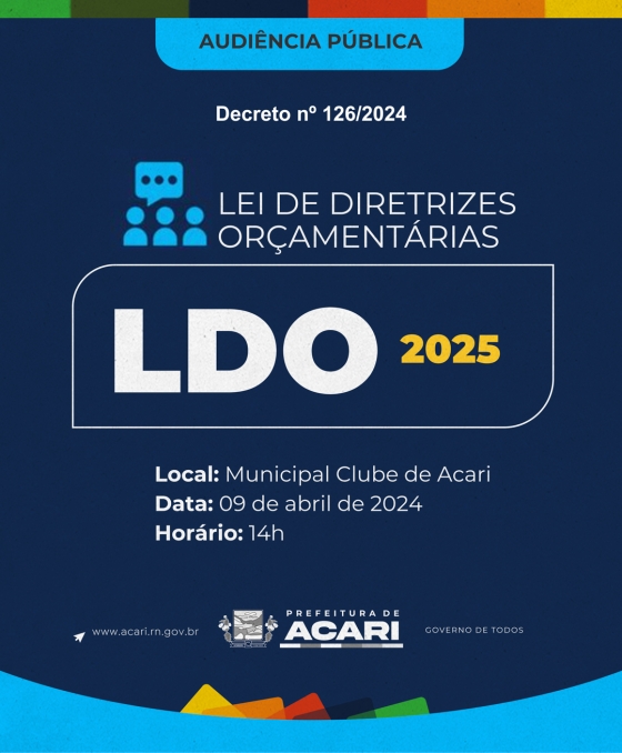 O Prefeito Municipal de Acari/RN, no uso de suas atribuições, e com fulcro na Lei Orgânica Municipal e na Constituição Federal, faz saber a quem interessar possa, especialmente aos cidadãos do Município de Acari, que fará realizar Audiência Pública, nos termos do Decreto nº 126/2024, para apresentar e discutir as adequações e metas para a LEI DE DIRETRIZES ORÇAMENTÁRIAS (LDO) para o exercício de 2025 do Município de Acari, conforme segue abaixo.