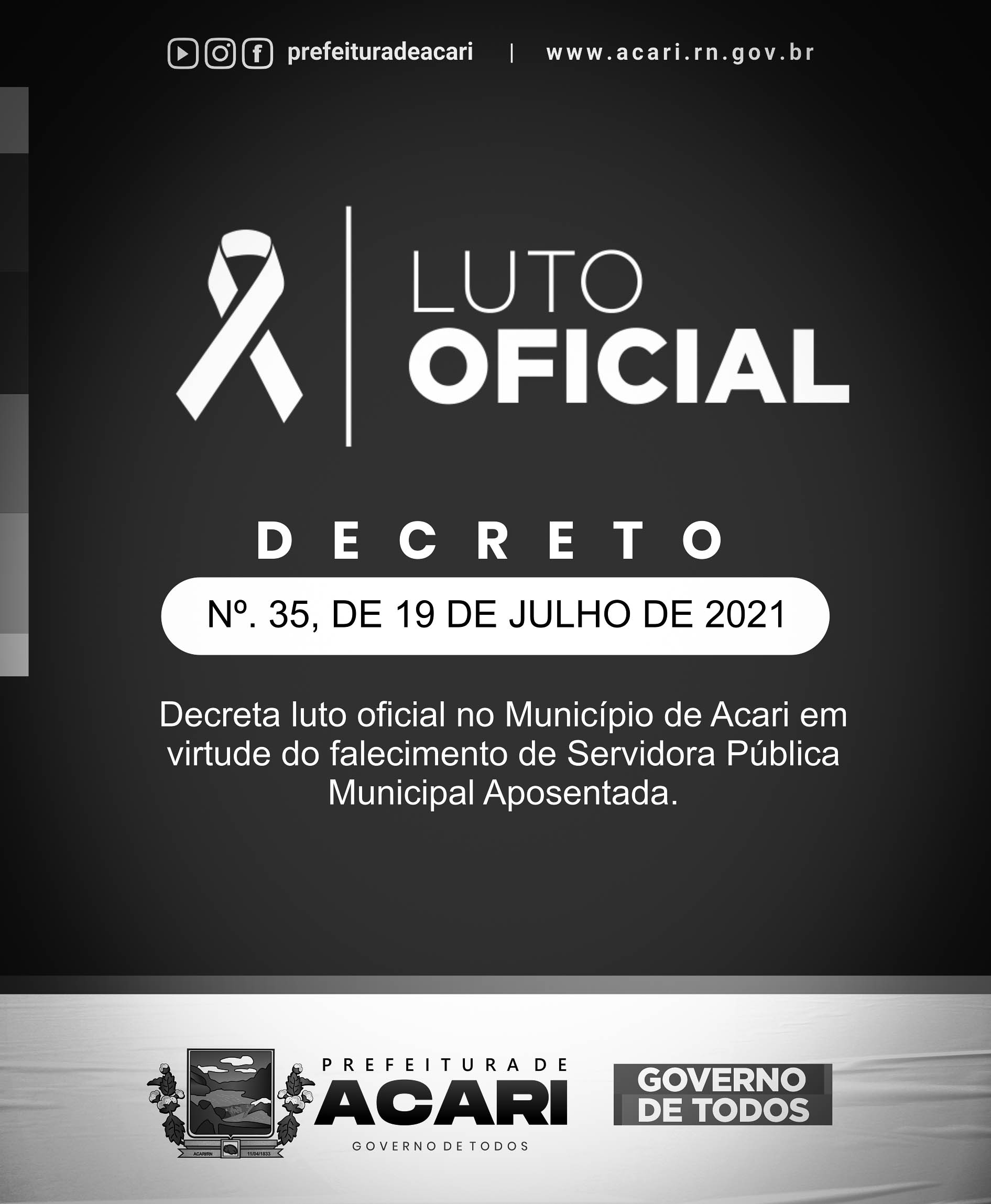 DECRETO Nº. 35, DE 19 DE JULHO DE 2021 O PREFEITO DO MUNICÍPIO DE ACARI/RN, usando das atribuições conferidas pelos dispositivos constantes na Lei Orgânica Municipal, CONSIDERANDO o falecimento da Servidora Pública Municipal Aposentada VALDENIR LIMA DE ARAÚJO, ocorrido na manhã desta segunda-feira, 19 de julho de 2021; CONSIDERANDO os relevantes serviços prestados por VALDENIR LIMA DE ARAÚJO, no exercício das suas atividades no serviço público municipal, bem como pela sua participação, como Professora e Diretora das Escolas Públicas Municipais Cipriano Santa Rosa e Terezinha de Lourdes Galvão, nas atividades dedicadas ao aprimoramento da Educação Pública no Município de Acari; DECRETA: Art. 1º - Fica decretado LUTO OFICIAL, por (03) três dias, no Município de Acari em sinal de pesar pelo falecimento de VALDENIR LIMA DE ARAÚJO. Art. 2º - Este Decreto entra em vigor na data de sua publicação. Registre-se. Publique-se. Dê-se ciência. Acari/RN, 19 de julho de 2021. FERNANDO ANTONIO BEZERRA Prefeito Municipal