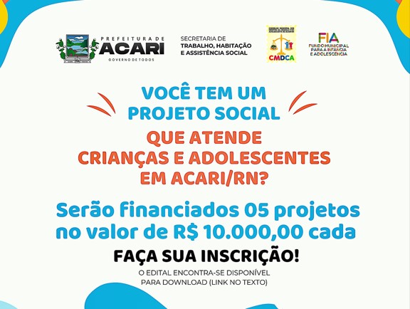 A #PrefeituraDeAcari, através da Secretaria de Trabalho, Habitação e Assistência Social (SEMTHAS) e o Conselho Municipal dos Direitos da Criança e do Adolescente (CMDCA), vem comunicar que está aberto o Edital nº 001/2022, que prevê financiamento de projetos de cunho social, complementares ou inovadores, voltados às políticas públicas de atendimento da criança e do adolescente, em conformidade com o que estabelece o Estatuto da Criança e do Adolescente - Lei n° 8.069/1990, a Resolução nº 137/2010 do CONANDA e a Resolução nº 002/2022 do CMDCA de Acari – RN que trata da aplicação de Recursos.