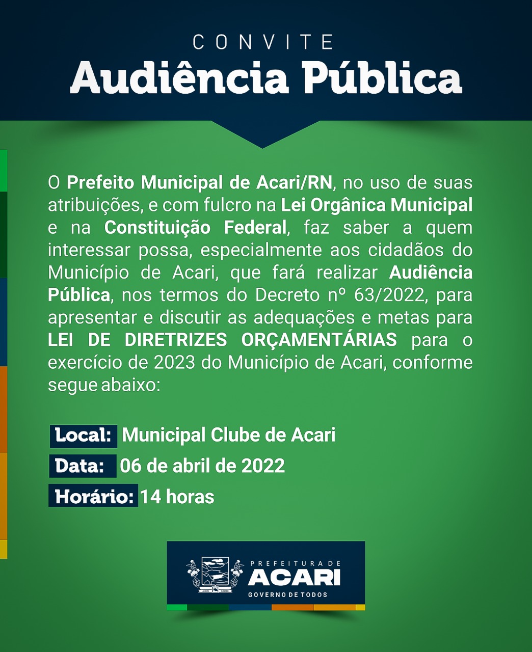 O Prefeito Municipal de Acari/RN, no uso de suas atribuições, e com fulcro na Lei Orgânica Municipal e na Constituição Federal, faz saber a quem interessar possa, especialmente aos cidadãos do Município de Acari, que fará realizar Audiência Pública, nos termos do Decreto nº 63/2022, para apresentar e discutir as adequações e metas para LEI DE DIRETRIZES ORÇAMENTÁRIAS para o exercício de 2023 do Município de Acari, conforme segue abaixo: