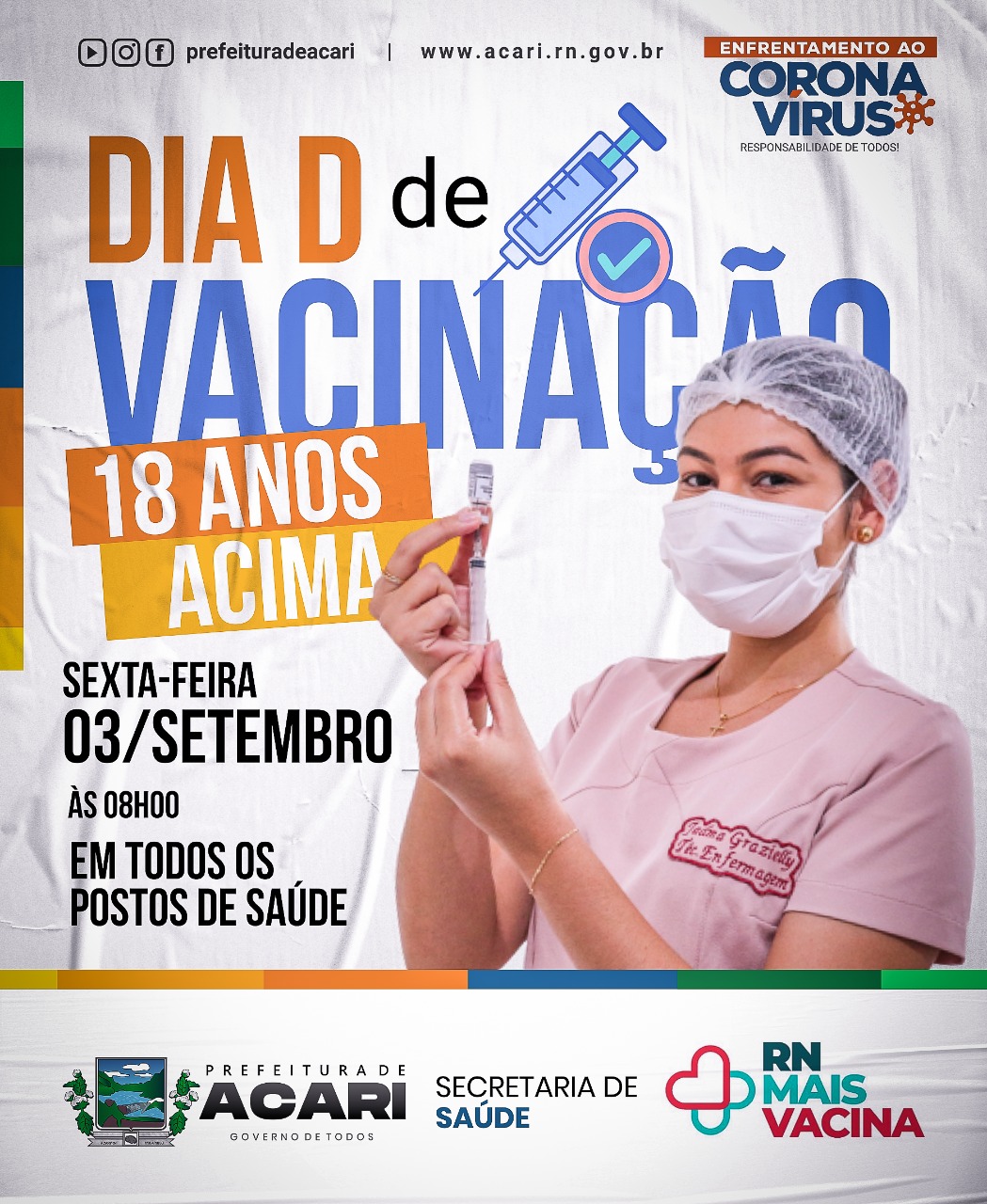 Atenção acarienses, com idade de 18 anos ou mais, que ainda não se vacinaram contra a Covid-19! A Prefeitura de Acari, através da Secretaria Municipal de Saúde comunica que a partir das 08h00 desta sexta-feira, dia 03 de setembro, estará realizando o "Dia D" de vacinação.