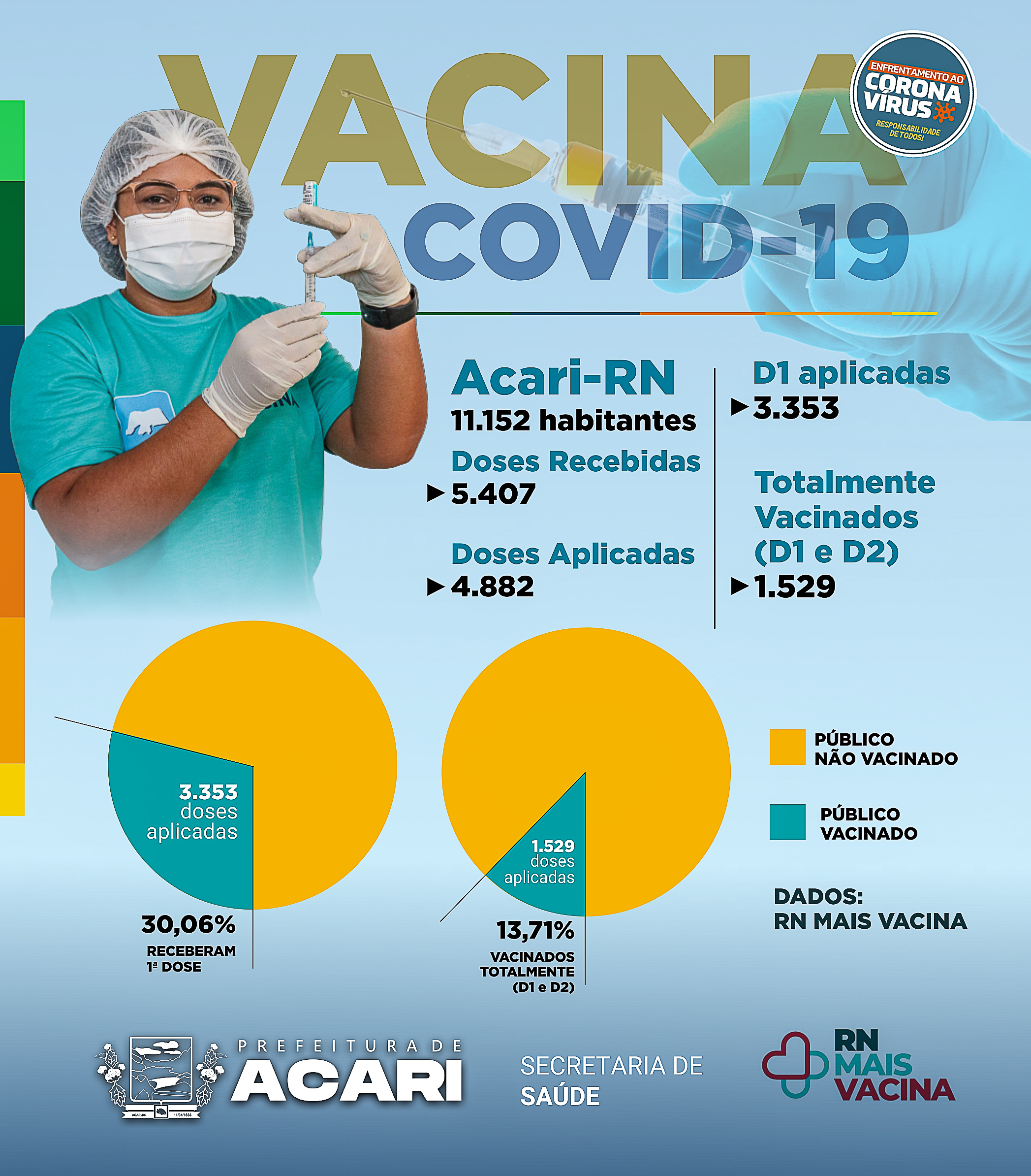 A secretaria municipal de saúde de Acari tem buscado, na medida do possível, avançar com a vacinação contra a Covid-19, atendendo os públicos prioritários: Professores Creche e Pré-escola, fundamental 1 e 2 (Faltando apenas nível médio), Idosos até 60 anos, gestantes e puérperas, hipertensos, diabéticos, imunosuprumidos, cardiopatas, obesos, e portadores de doenças pulmonares instrutivas crônicas, beneficiários do BPC com deficiência permanente e trabalhadores de saúde.