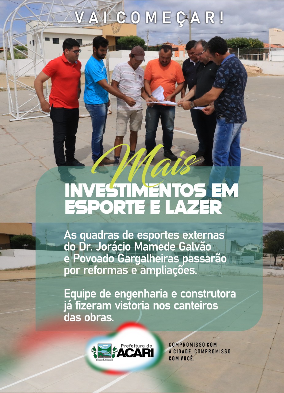 Após reformar e ampliar várias praças de esportes e construir uma nova no Povoado Bulhões, a gestão municipal de Acari-RN dará início a mais obras importantes para o esporte e lazer. Em breve, as quadras externas do Ginásio de Esporte Dr. Jorácio Mamede Galvão e do Povoado Gargalheiras estarão passando por reformas e ampliações, investimentos que trarão mais qualidade para a prática desportiva no município.
