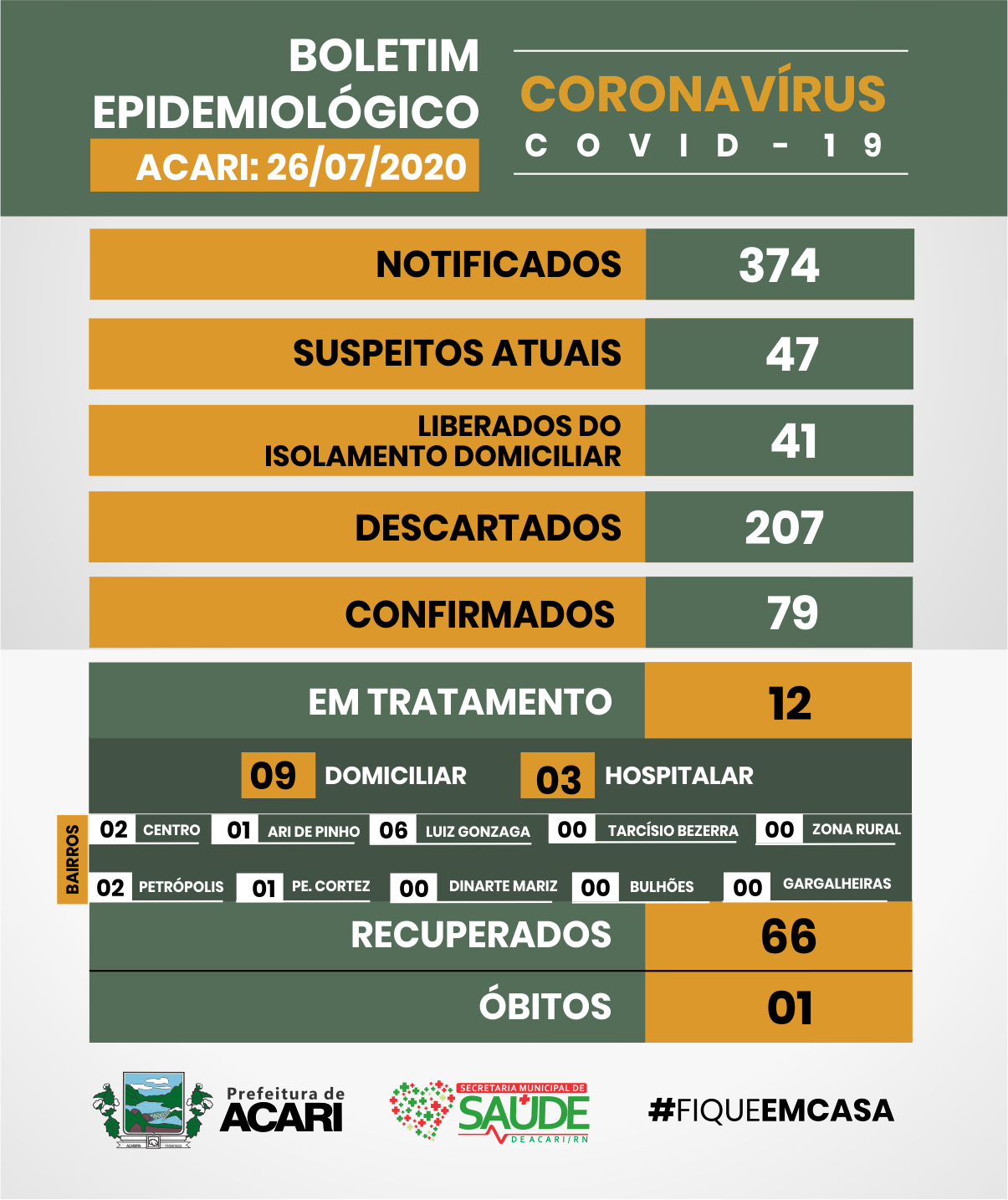 A Secretaria Municipal de Saúde de Acari-RN comunica que neste domingo, dia 26 de julho, notificou apenas dois (02) casos SUSPEITOS de Covid-19, 02 pacientes do sexo masculino (35 e 64 anos de idade).