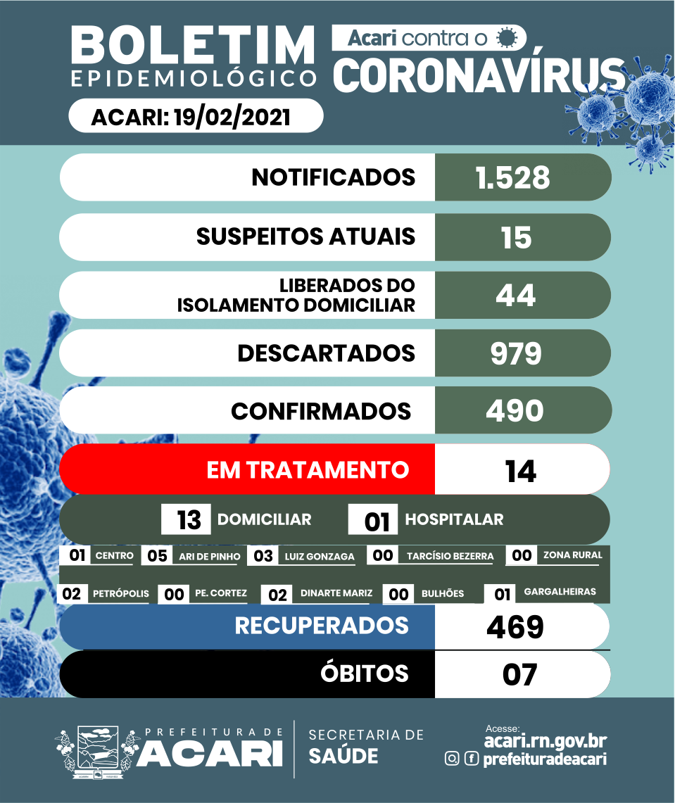 A Secretaria Municipal de Saúde de Acari-RN comunica que nesta sexta, dia 19 de fevereiro, notificou dois (02) casos suspeitos de Covid-19, 01 do sexo feminino (88 anos) e 01 do sexo masculino (26 anos).