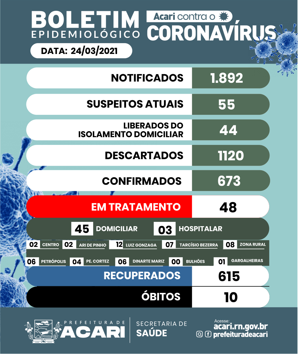 A Secretaria Municipal de Saúde de Acari-RN comunica que nesta quarta-feira, dia 24 de março, notificou dezesseis (16) casos suspeitos de Covid-19, 08 do sexo masculino (45, 30, 28, 27, 50, 26, 27 e 36 anos) e 08do sexo feminino (31, 25, 27, 17, 25, 37, 63 e 35 anos).