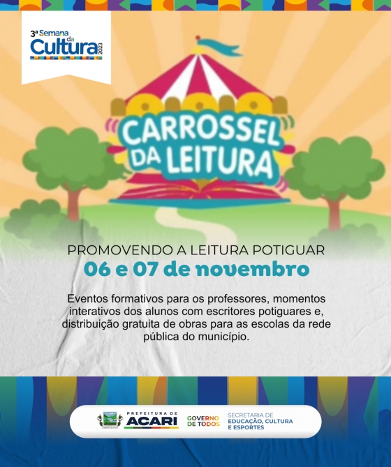 Na 3ª Semana da Cultura, o município de Acari promoverá incentivo à literatura Potiguar. Estará presente, nos dias 06 e 07 de novembro, em Acari, o "Carrossel da Leitura" - projeto que tem como objetivo promover a literatura infantil potiguar e, possibilitar a aproximação dos escritores com os leitores, especialmente os alunos do ensino fundamental das escolas públicas.
