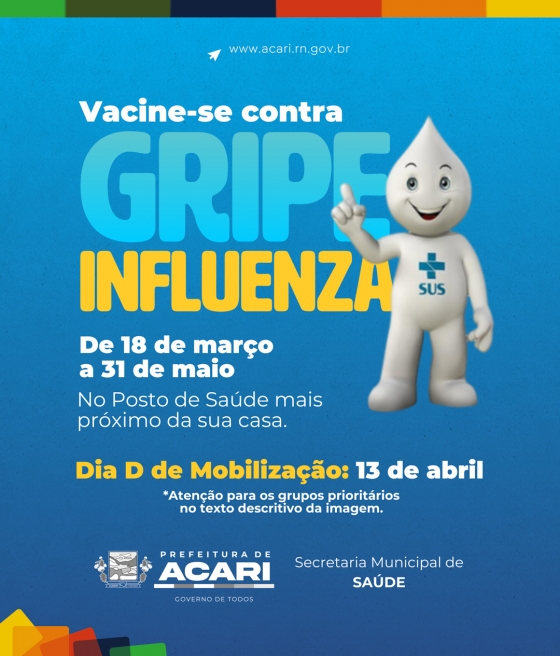 De 18 de março a 31 de maio de 2024 é o período para você se vacinar contra a GRIPE INFLUENZA! Em 13 de abril é o Dia D de Mobilização. Não deixe pra depois, procure o posto de saúde mais próximo e vacine-se!