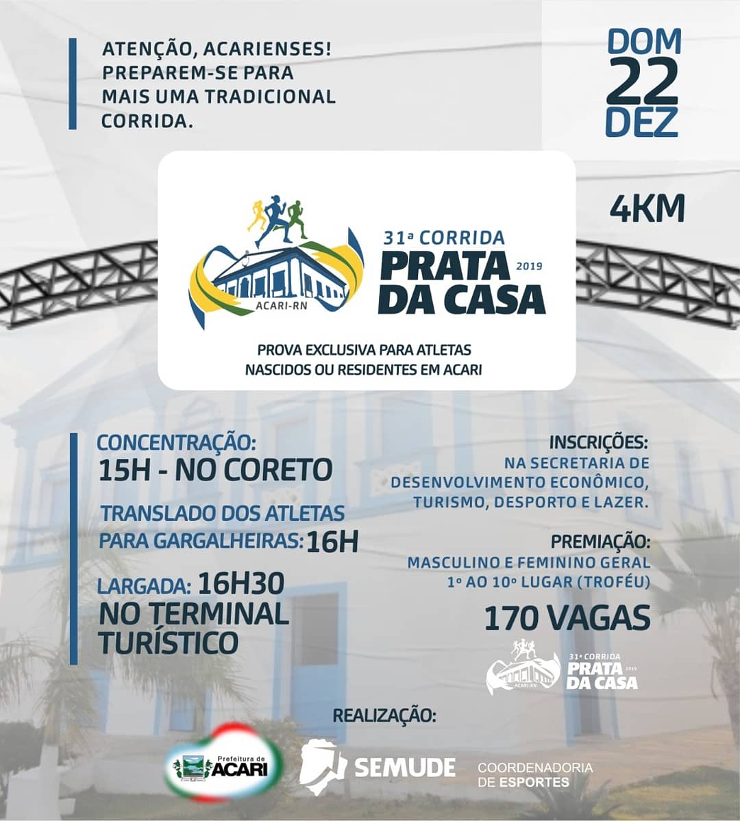 ATENÇÃO ATLETAS ACARIENSES: VEM AÍ A TRADICIONAL CORRIDA PRATA DA CASA EM ACARI NA SUA 31° EDIÇÃO
