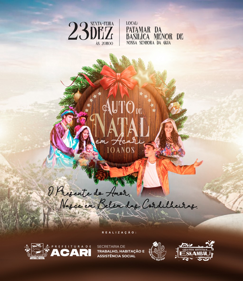 O município de Acari celebra 10 anos de Auto de Natal, sempre contando a mais bela história de amor da humanidade de maneiras diferentes, envolvendo crianças, jovens e adultos num espetáculo grandioso que emociona multidões. O espetáculo, que acontecerá dia 23 de dezembro (sexta-feira) é encenado no patamar da Basílica de Nossa Senhora da Guia.
