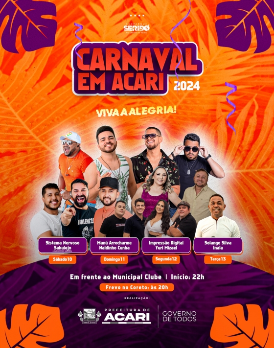 A Prefeitura de Acari convida você e sua família a prestigiar a programação preparada especialmente para a festa momesca, o Carnaval 2024. Acari, coração do Seridó, lhe receberá de braços abertos para cair na folia e viver a alegira vibrante, no Coreto, nas ruas e em frente ao Municipal Clube. Junte-se a nós para celebrar a magia do Carnaval e vivenciar momentos inesquecíveis.